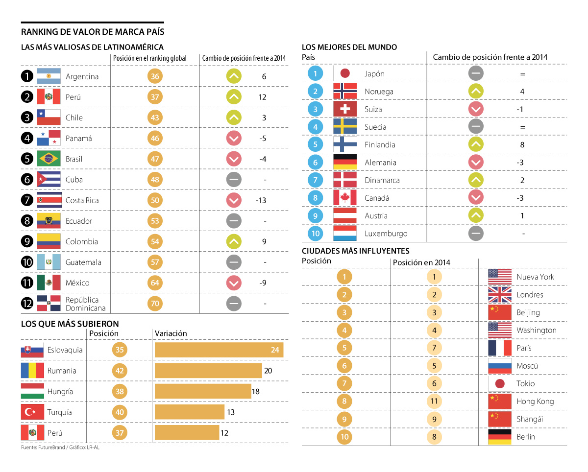 Así mismo, Perú se presentó como otro de los territorios con un rendimiento sobresaliente en valor de marca, debido a que, tras escalar 12 ubicaciones, llegó al puesto 37, con lo que no solo se consolidó como el segundo mejor país de la región, sino también como el de mayor cantidad de puestos ganados con respecto al estudio de hace cinco años. Pasar del puesto 49 al 37 llevó a que este país se ubicara como uno de los cinco con mayor mejoría en términos de marca país, según FutureBrand.