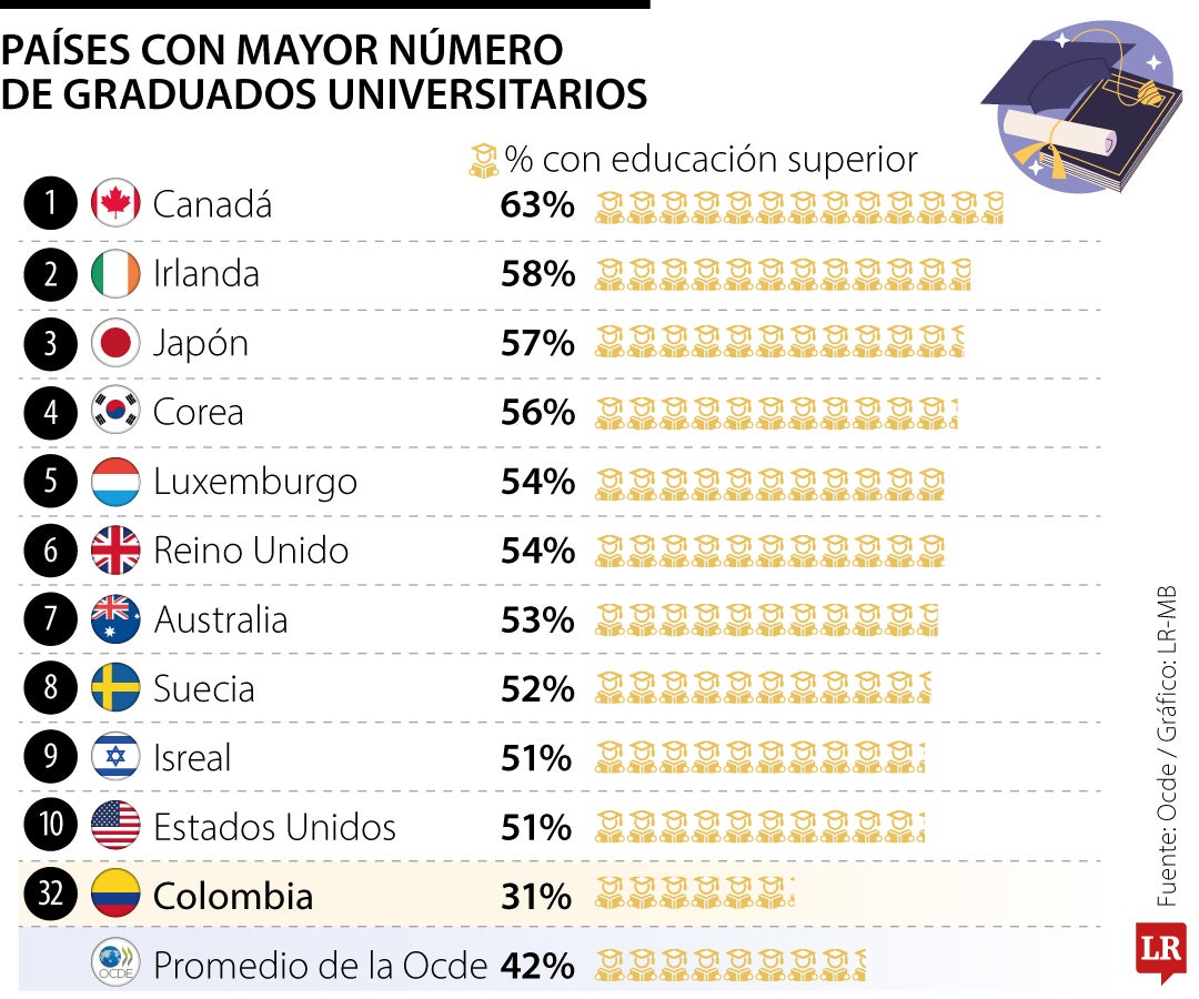 En el caso de Colombia, el país ocupa el puesto 32 del ranking con 31% de adultos entre 25 y 64 años con educación superior. Aunque se encuentra por debajo del promedio de la Ocde, la cifra muestra avances frente a décadas anteriores y ubica al país por encima de varias economías emergentes de gran tamaño.