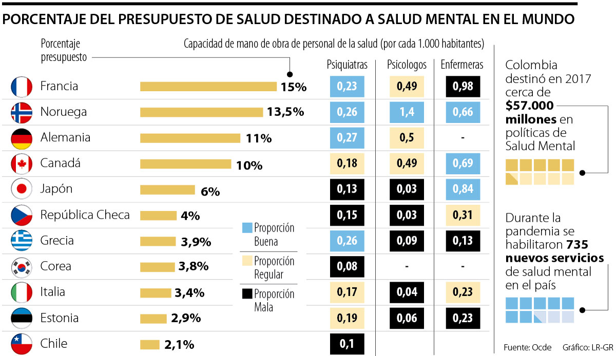 En la lista, los países con mejor presupuesto para salud mental son Francia y Noruega, con una inversión respectivamente de 15% y 13%. Por otro lado, Estonia y Chile son los países con las cifras más alarmantes, pues solo invierten 2,9% y 2,1% del total del presupuesto, lo que se traduce en que solo hay 0,1% de especialistas por cada 1.000 habitantes en ese último país.