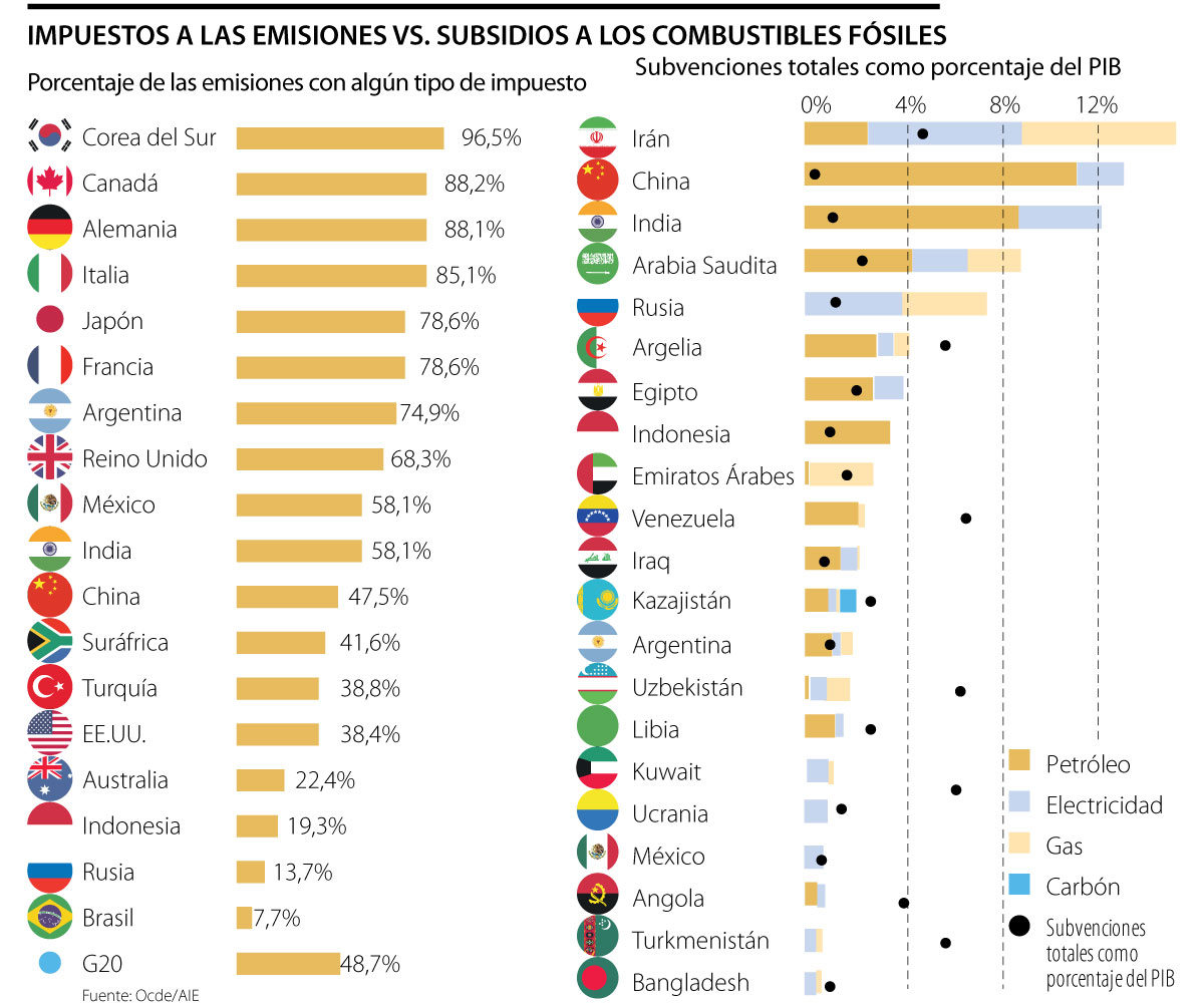 Sin embargo, la Ocde aclara que esto no es suficiente y que el principal problema es la enorme disparidad que hay entre los países del G20 en cuanto a la cantidad de emisiones que tiene impuestos. Es decir, mientras que en Corea del Sur un 96,5% del CO2 generado para la energía soporta alguna carga impositiva, solo 7,7% de las emisiones en Brasil tienen algún impuesto.