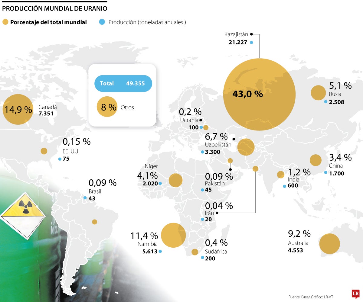 Kazajistán, Canadá, Namibia y Australia concentran dos tercios de la producción mundial; el mineral sirve para fabricar ojivas