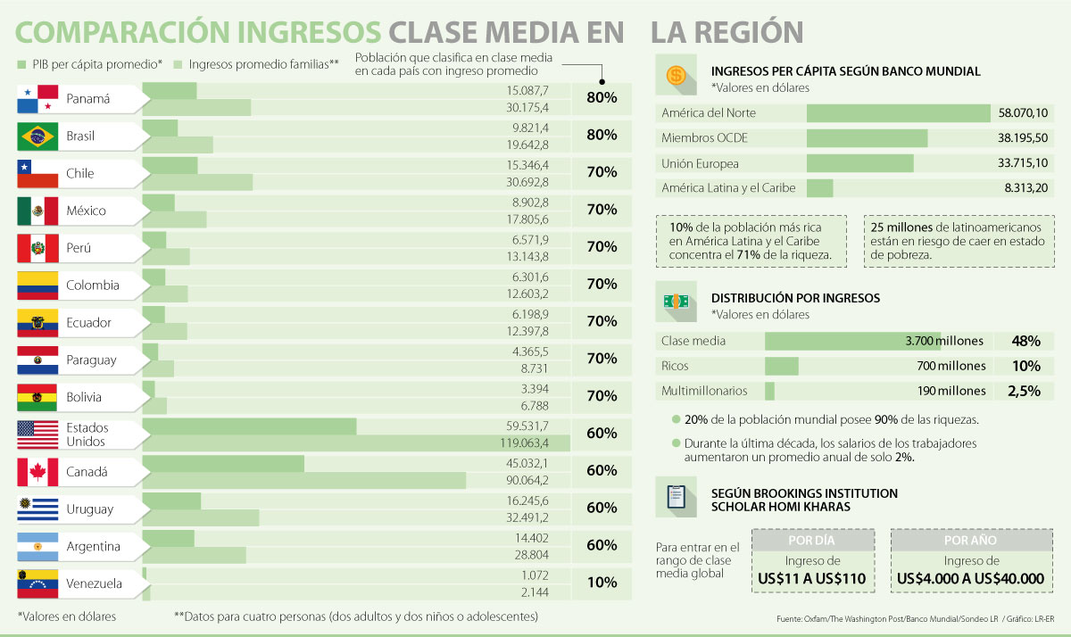 Sin embargo, las mayores excepciones a la regla para la región se encuentran en Chile, Panamá y Brasil que superan la cifra per cápita promedio con ingresos anuales de US$15.346,4; US$15.087,7 y US$9.821,4 y quienes ganan estos montos se ubican entre el 80% y 70% con mayores ingresos entre la clase media de cada uno de sus países.