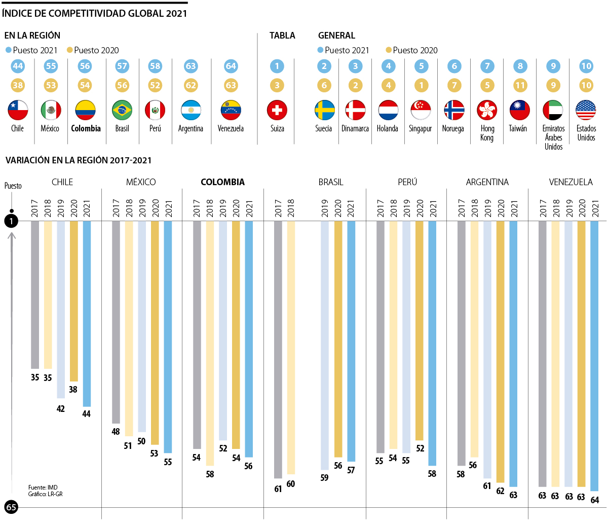 Colombia perdió dos posiciones en el ranking de competitividad 2021, publicado por IMD, luego de pasar de la posición 54 a la 56