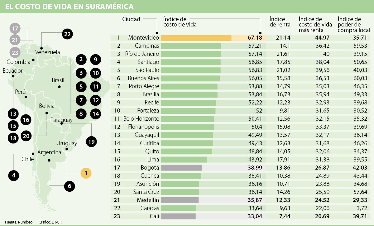 Si se compara Montevideo y Cali, la base de datos señala que los precios al consumidor en la primera son 104,17% más altos que en la segunda, mientras que el poder de compra local, que es la capacidad de compra en cada ciudad con el salario promedio de la misma, es 9,5% menor en Montevideo que en Cali.