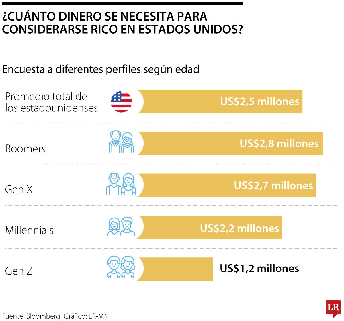 Cuanto mayor es una persona, mayor es su definición de riqueza en la encuesta. Los baby boomers, personas nacidas entre 1945 y 1964, dicen que para ser rico se necesitan US$2,8 millones, mientras que los millennials sitúan la cifra en US$2,2 millones. En general, cerca de uno de cada cinco estadounidenses dijo que estaba “en camino” de ser rico y 10% dijo que ya lo era.