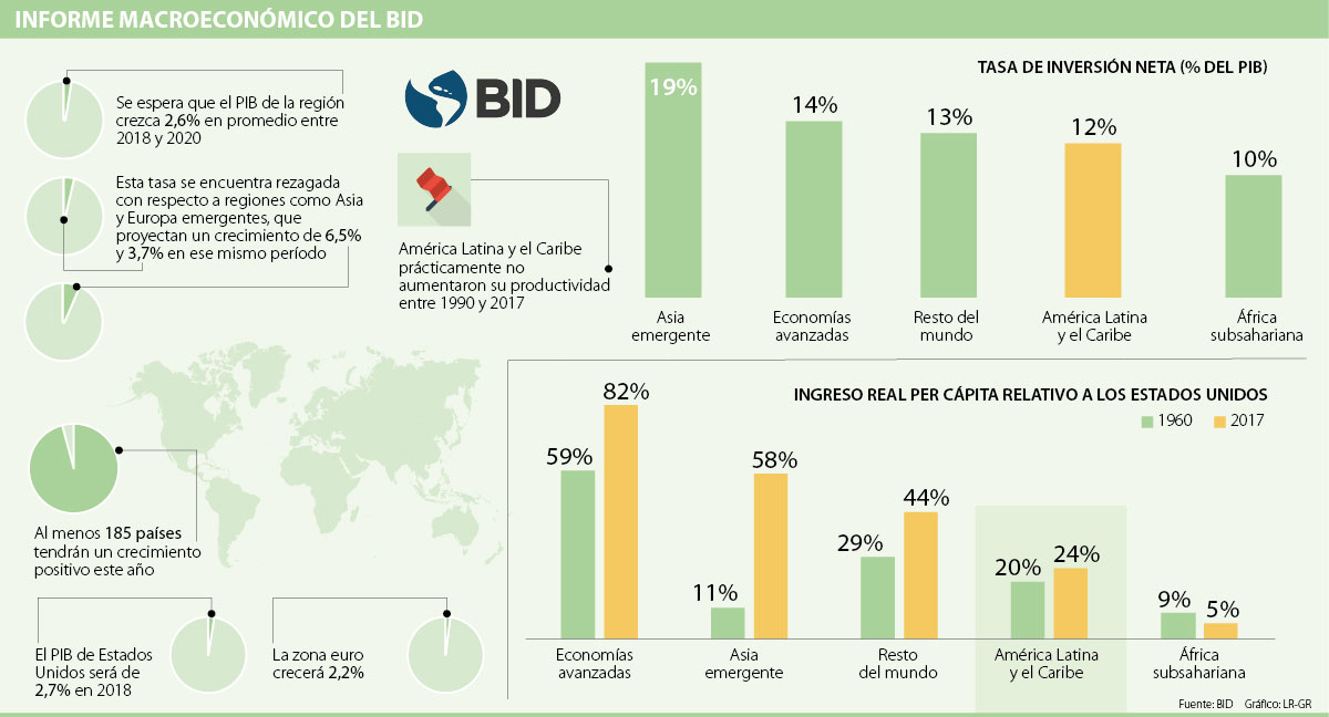 América Latina y el Caribe volvió a la senda de crecimiento, pero no lo suficiente, según el más reciente informe macroeconómico que realizó el Banco Interamericano de Desarrollo (BID). Según el estudio, se espera que el PIB de la región crezca 2,6% en promedio entre 2018 y 2020, pero aún por debajo de las regiones emergentes.