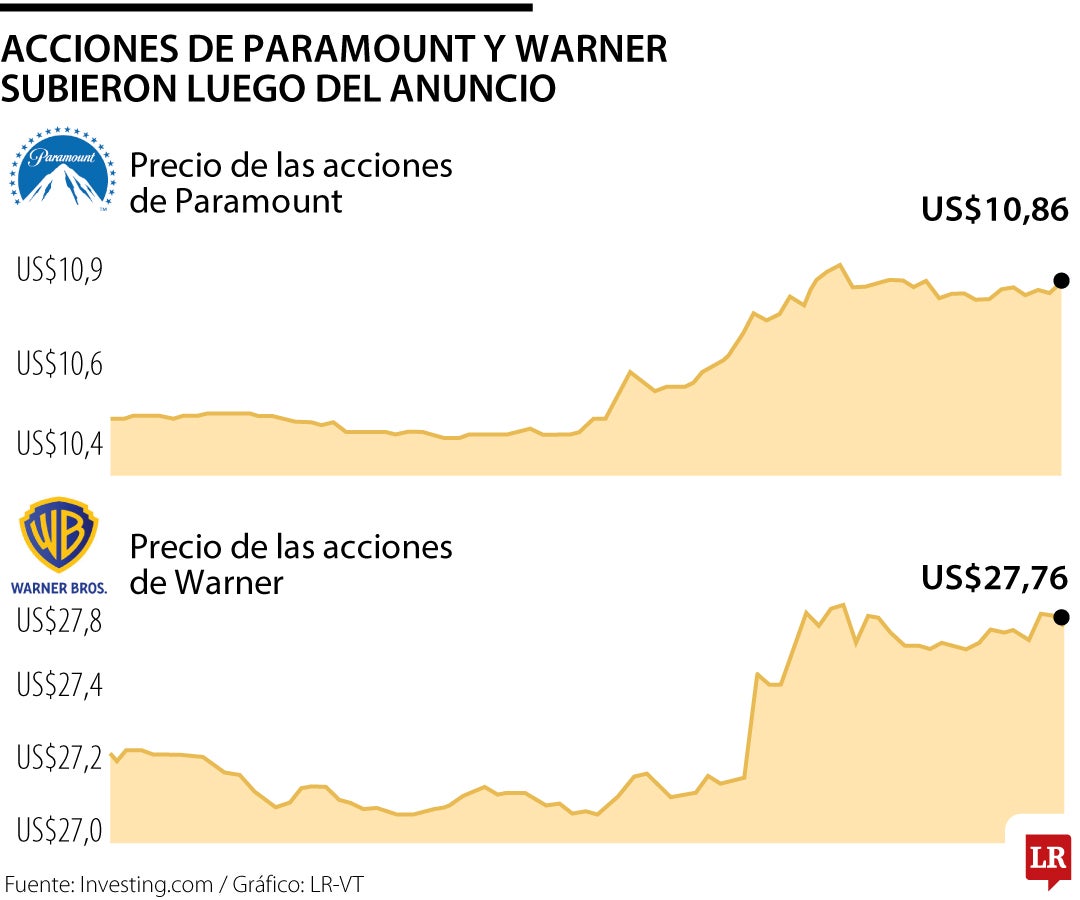 Las acciones de Paramount y Warner Bros. subieron más de 1% tras el anuncio. Netflix fue la que más subió, 2,5%, lo que sugiere que los inversores que se han mostrado escépticos ante la transacción podrían alegrarse de que Paramount ofrezca una mejor alternativa.