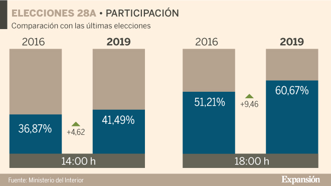 Los datos publicados por el Ministerio del Interior sitúan la participación en las elecciones generales de este 28 de abril en el 60,75% del censo a las seis de la tarde. Esto implica que un total de 20.446.975 personas han votado ya este domingo, frente a las 17.715.754 que lo hicieron a esa hora hace tres años. A las 14.00 horas, este porcentaje se situó en el 41,49%, 4,62 puntos por encima de la cifra registrada en los comicios de hace tres años (36,87%).