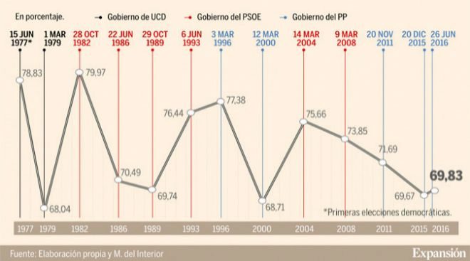 Más de 36,89 millones de españoles están llamados a las urnas este domingo para elegir a sus representantes en las Cortes Generales, 208 senadores y 350 diputados. El reto de todas las formaciones que, como es habitual, se han desvivido durante la campaña y durante esta mañana para movilizar a los más aletargados, es que esta cuota supere el 70% ya que en las dos últimas convocatorias se rozó ese dato, con el 69,67% de las generales de diciembre de 2015 y el 69,84% en las de junio de 2016. Estas cifras fueron, en todo caso, inferiores a la media del período democrático, que se sitúa en el 72,8%, con el pico más alto en las constituyentes de 1977, en las que votó el 78,83% del electorado. La cota más baja se dio en los comicios de marzo de 1979, cuando descendió hasta el 68,04%.