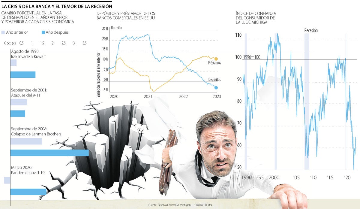 En periodos de crisis pasada, la recesión llegó luego de un debilitamiento de la economía, tal como hoy lo ven analistas con tasas altas, enfriamiento del consumo y sectores con empresas de cara a la quiebra (que es lo que preocupa a algunos luego del tambaleo de bancos).