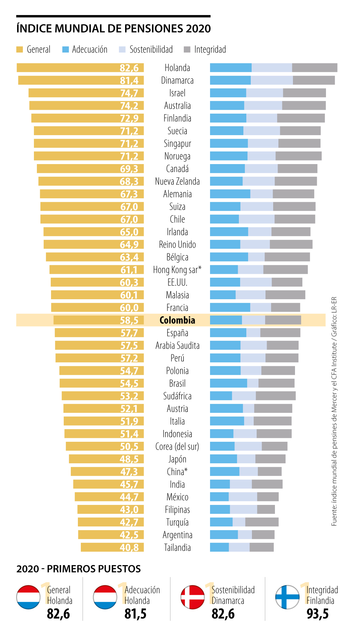 “Es importante resaltar que Colombia es el segundo mejor país latinoamericano dentro del índice, por encima de Brasil, México, Perú y Argentina. Tenemos características muy positivas como los niveles de ahorro, y otros bastantes deficientes como la coexistencia de regímenes y subsidios mal focalizados”, comentó David Cuervo, director de Bienestar Financiero y Patrimonial en Mercer Colombia.
