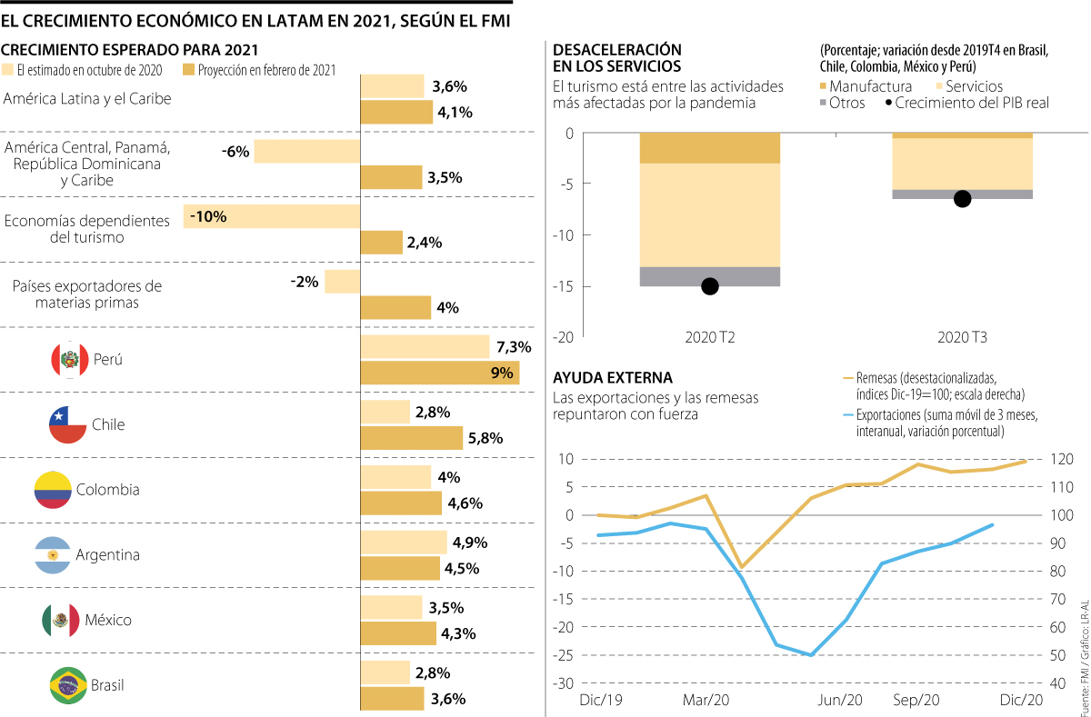 Así mismo, el FMI, afirma que la región seguirá siendo una de la más golpeadas por los efectos secundarios del primer año de pandemia, y que la recuperación en la región será la más desigual en el mundo, pues mientras se proyectan números como los de Perú y Chile, hay casos como el de Aruba, Bahamas, Barbados y Jamaica, donde no habrá un crecimiento mayor a 2,4%, debido al fuerte impacto negativo que recibió la industria del turismo en estos lugares.
