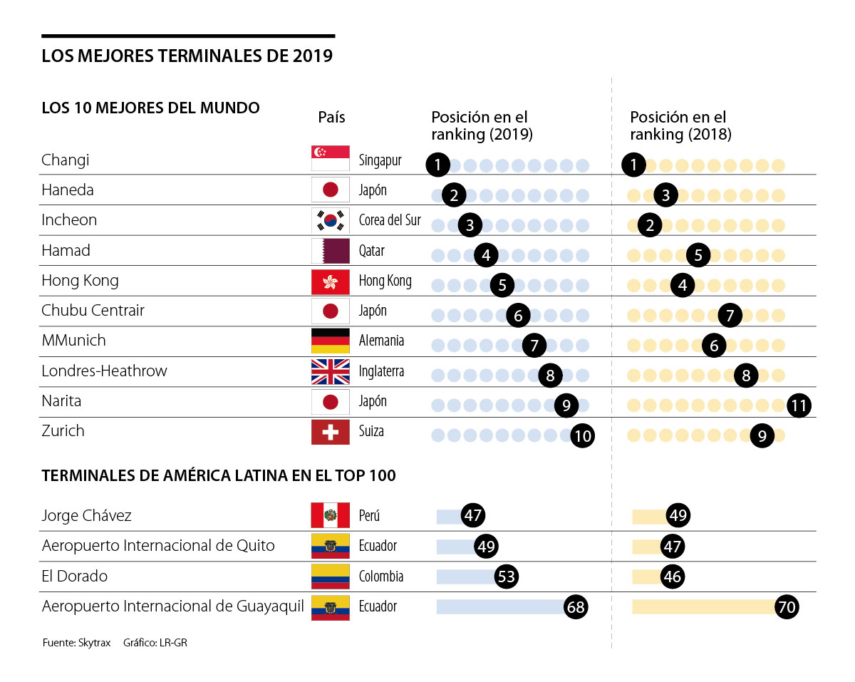 La auditora británica Skytrax destacó nuevamente a Perú, Ecuador y Colombia en el top 100 de los mejores aeropuertos del mundo para 2019. No obstante, el listado de este año dejó por fuera a Panamá dentro de los países con terminales destacadas e indicó que el aeropuerto El Dorado perdió el liderato de la región en este campo.