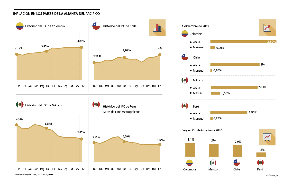 El país que presentó no solo la inflación más baja en la Alianza del Pacífico, sino de la región, fue Perú. Con base en la cifra de 1,90%, se espera que para 2020 este dato “se mantenga alrededor del centro del rango meta, en un contexto de expectativas de inflación cercanas a 2%, una inflación importada moderada, ausencia de choques de oferta significativos y una brecha del producto negativa que se va cerrando de manera gradual”, explicó el Banco Central de Reserva de Perú en un informe.