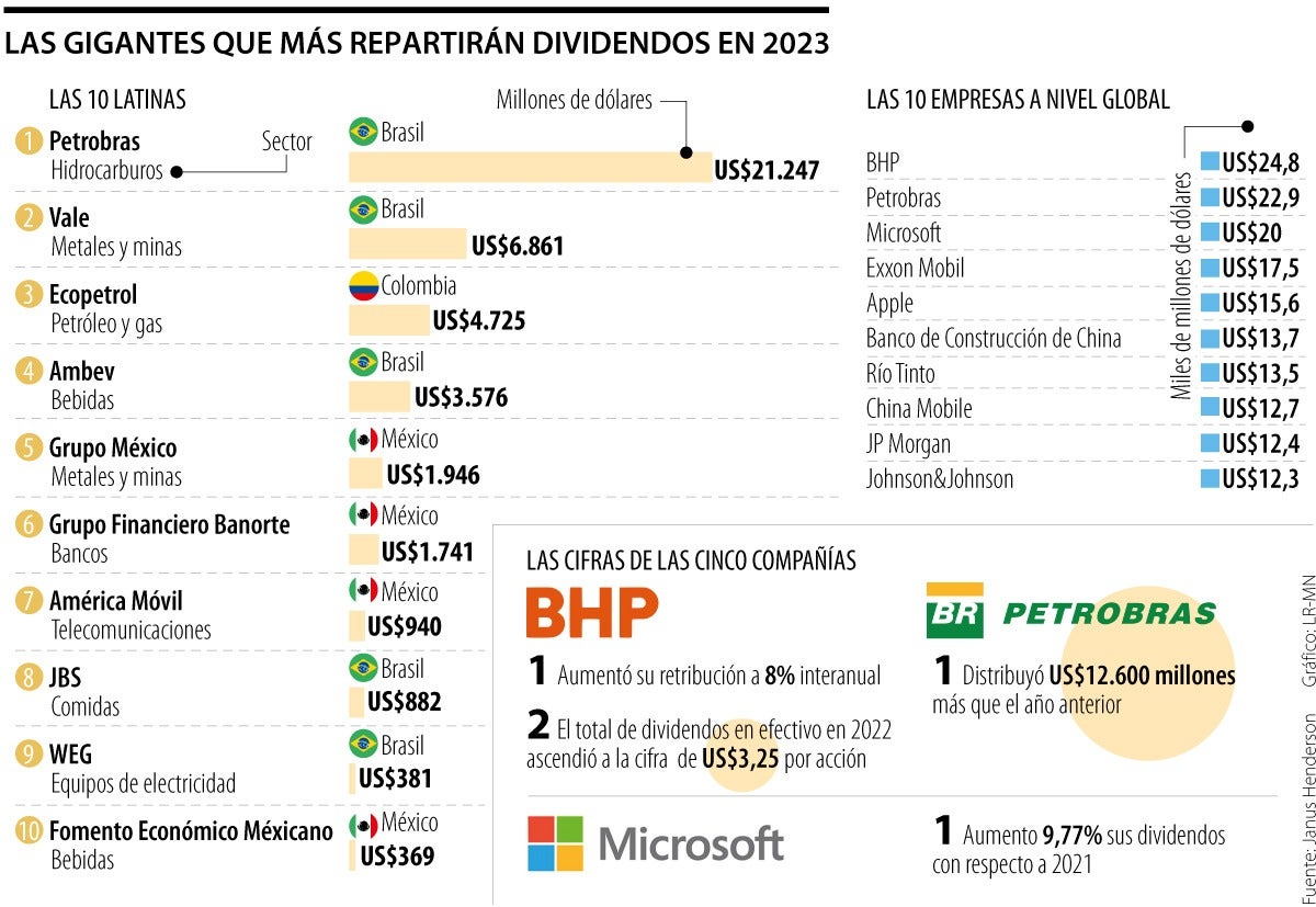 A nivel mundial, las compañías que más repartieron dividendos fueron la minera BHP, le sigue la regional Petrobras y de tercera Microsoft. Mientras que, a nivel Latinoamérica, la petrolera brasileña lidera la lista, seguida de la empresa de ese mismo país Vale, y de tercera, una colombiana: Ecopetrol.