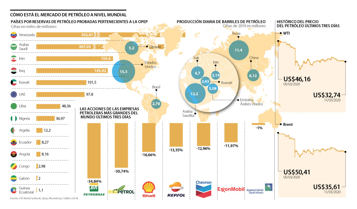 Tras conocerse la decisión rusa y a medida que las plazas del sector energético caían, los precios del Brent y WTI registraron desplomes cercanos a 30%. Esto es un reflejo del peso que tienen Arabia Saudita y Rusia en el mercado petrolero, ya que ambos son los mayores productores del cartel con 12,2 millones y 11,4 millones de barriles de producción diaria, respectivamente.