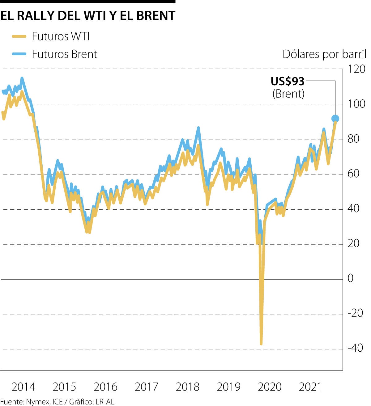 El petróleo se disparó a un nuevo máximo de siete años manteniéndose cerca de US$93 por barril, y casi todos los indicadores apuntan a que la recuperación se extenderá.