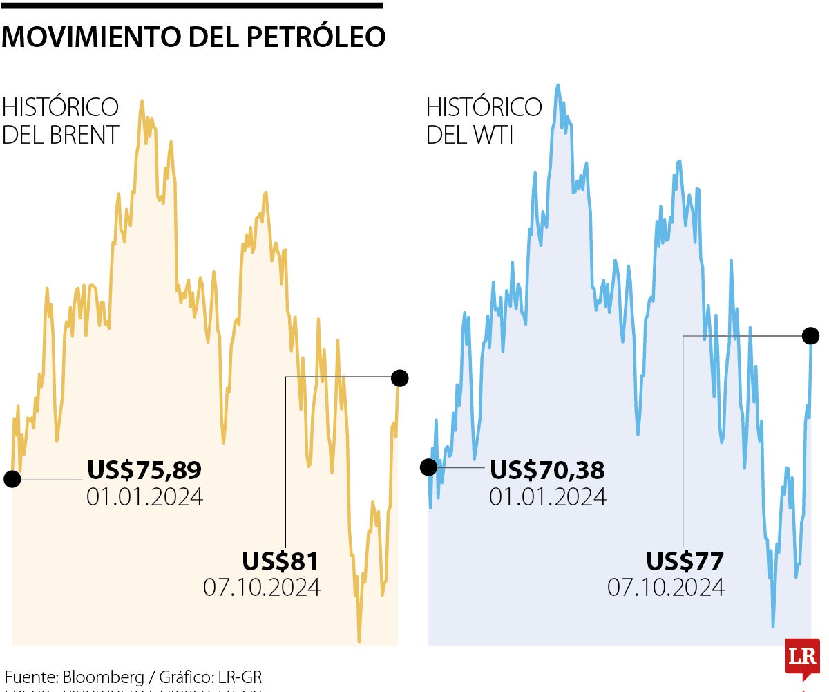 El petróleo brent superó los US$80 el barril (su precio más alto desde agosto), al tiempo que las crecientes tensiones en Medio Oriente aumentaron las especulaciones sobre la posibilidad de que Israel ataque la infraestructura petrolera de Irán (un país de la Opep).