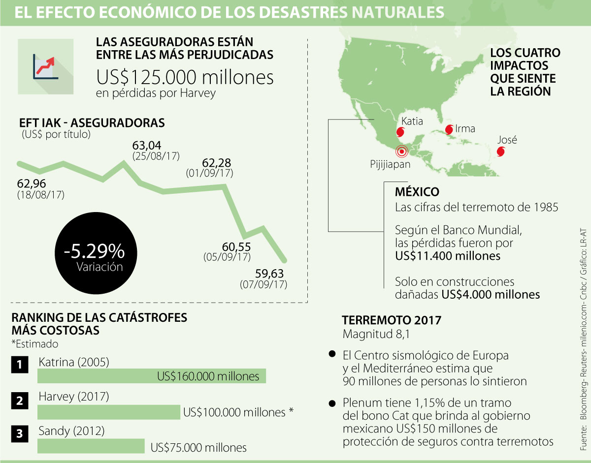 México, tras el terremoto del jueves en la noche, anunció que utilizará recursos de la activación de bonos catastróficos. La semana pasada el Banco Mundial hizo la emisión de US$360 millones de estos, de los cuales 1,15% de US$150 millones del bono Cat, que brinda protección al gobierno mexicano por sismos, pertenecen a Plenum. Por lo tanto, se ven en riesgo estas emisiones luego de una semana de haber salido al mercado.