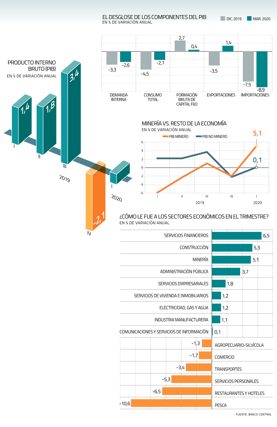 El ministro de Economía, Lucas Palacios, destacó que en el primer trimestre destacaron los desempeños de la minería, la construcción y los servicios financieros y, por el lado del gasto, la resiliencia de la inversión en construcción y obras (+6,3%). Por el lado negativo, acotó, los sectores más afectados están siendo servicios personales, comercio, transporte, restaurantes y hoteles. "Aquí es donde deben concentrarse nuestros mayores esfuerzos", subrayó a través de su cuenta de Twitter. "Sabemos que vienen meses muy complejos para la actividad y, por lo tanto, para el empleo. Por eso, estamos trabajando intensamente para atenuar al máximo el daño que esta recesión está causando", dijo.