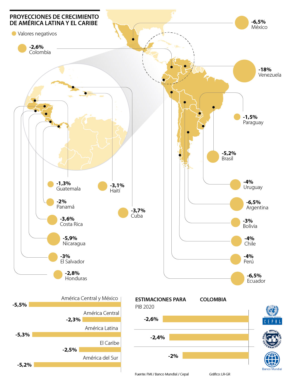 En la publicación de la Cepal también se evidencia que los países que presentarán las mayores contracción en su PIB son Venezuela (-18%), México (-6,5%), Argentina (-6,5%), Ecuador (-6,5%), Nicaragua (-5,9%) y Brasil (-5,2%) (ver gráfico). De acuerdo con Jaramillo, en el caso de Argentina no hay que dejar de lado que su contracción se debe principalmente a que tiene una política económica volátil, lo cual es negativo en una coyuntura como esta, ya que las medidas que se adoptan para combatir el virus tienden a aumentar el déficit fiscal.
