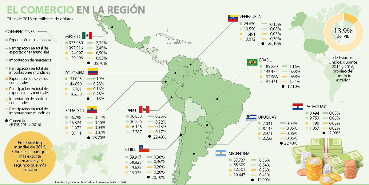 De acuerdo con la información disponible en la base de datos de la Organización Mundial del Comercio (OMC), la cual está actualizada hasta 2016, el país de la región cuyo comercio internacional aportó más porcentaje a su Producto Interno Bruto (PIB), entre 2014 y 2016, fue Paraguay, con 41,9%.