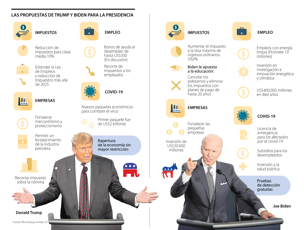 Tanto Biden como Trump le apuestan a la recuperación económica del país tras el impacto de la pandemia; uno de los puntos clave será la tasa de desempleo que para finales de septiembre se ubicó en 7,9%. A continuación un resumen de los proyectos económicos más sobresalientes.