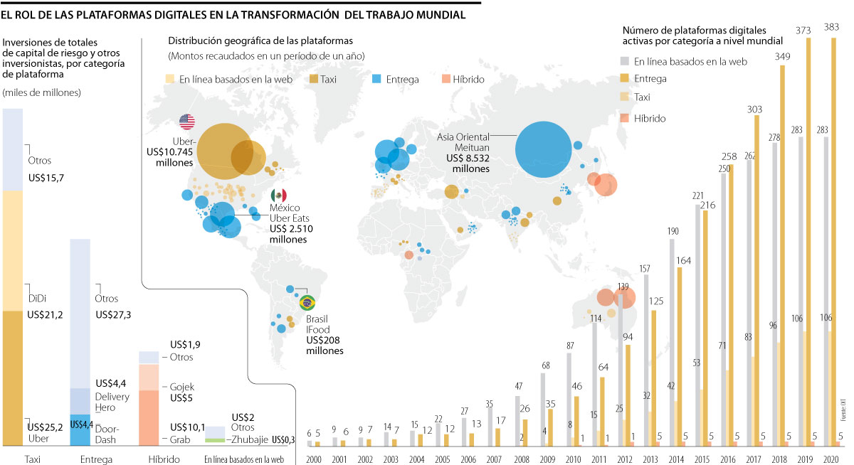 De acuerdo con las más recientes estimaciones de la Organización Internacional del Trabajo (OIT) en su informe ‘Perspectivas Sociales y del Empleo en el Mundo: El papel de las plataformas digitales en la transformación del mundo del trabajo’, alrededor del planeta hay 338 plataformas dedicadas a las entregas o domicilios, 283 destinadas a servicios en la red, 106 que prestan servicios de transporte y cinco grandes compañías híbridas que prestan uno o más de estos servicios.