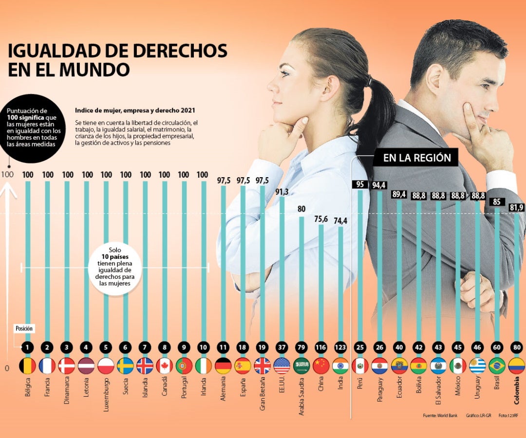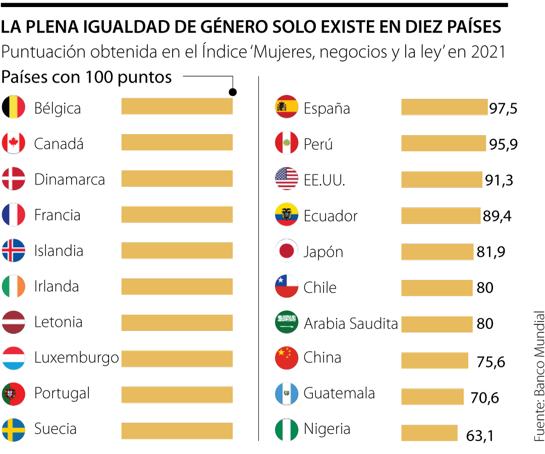 De acuerdo con el último informe publicado por el Grupo del Banco Mundial 'Women, business and the law 2021', Bélgica, Francia, Dinamarca, Letonia, Luxemburgo, Suecia, Canadá, Islandia, Portugal e Irlanda son los únicos países que ofrecen plena igualdad de derechos para hombres y mujeres, al menos desde el punto de vista jurídico. Por ello, dichos países han obtenido 100 puntos dentro de la medición, logrando así, la máxima calificación en esta materia.