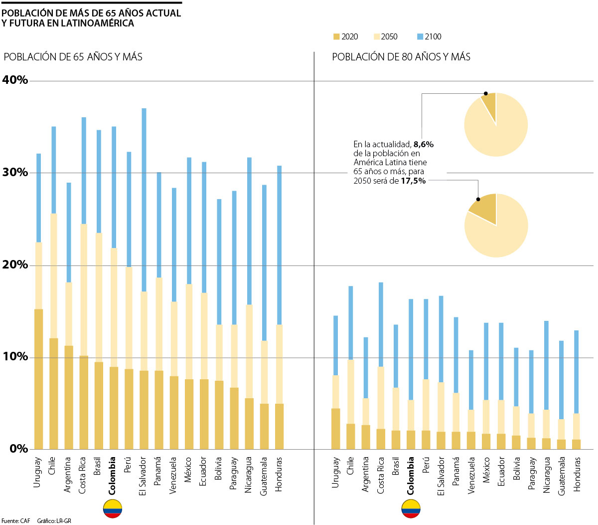Para el caso colombiano ocurre algo similar: los adultos mayores de 65 años equivalen al 9% de la población total actual, pero para el 2050 la CAF pronostica que el número aumentará al 21%; mientras que para 2100 los mayores de 65 años compondrán el 34% del total de la población en Colombia.