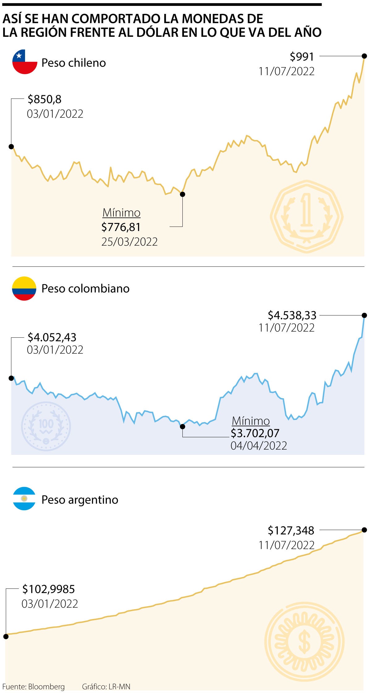 La baja del cobre y la preocupación por una recesión mundial ha llevado a que el peso se deprecie 15% en el último mes, y lo ha convertido en la divisa de peor desempeño entre 23 monedas de mercados emergentes monitoreadas por Bloomberg.