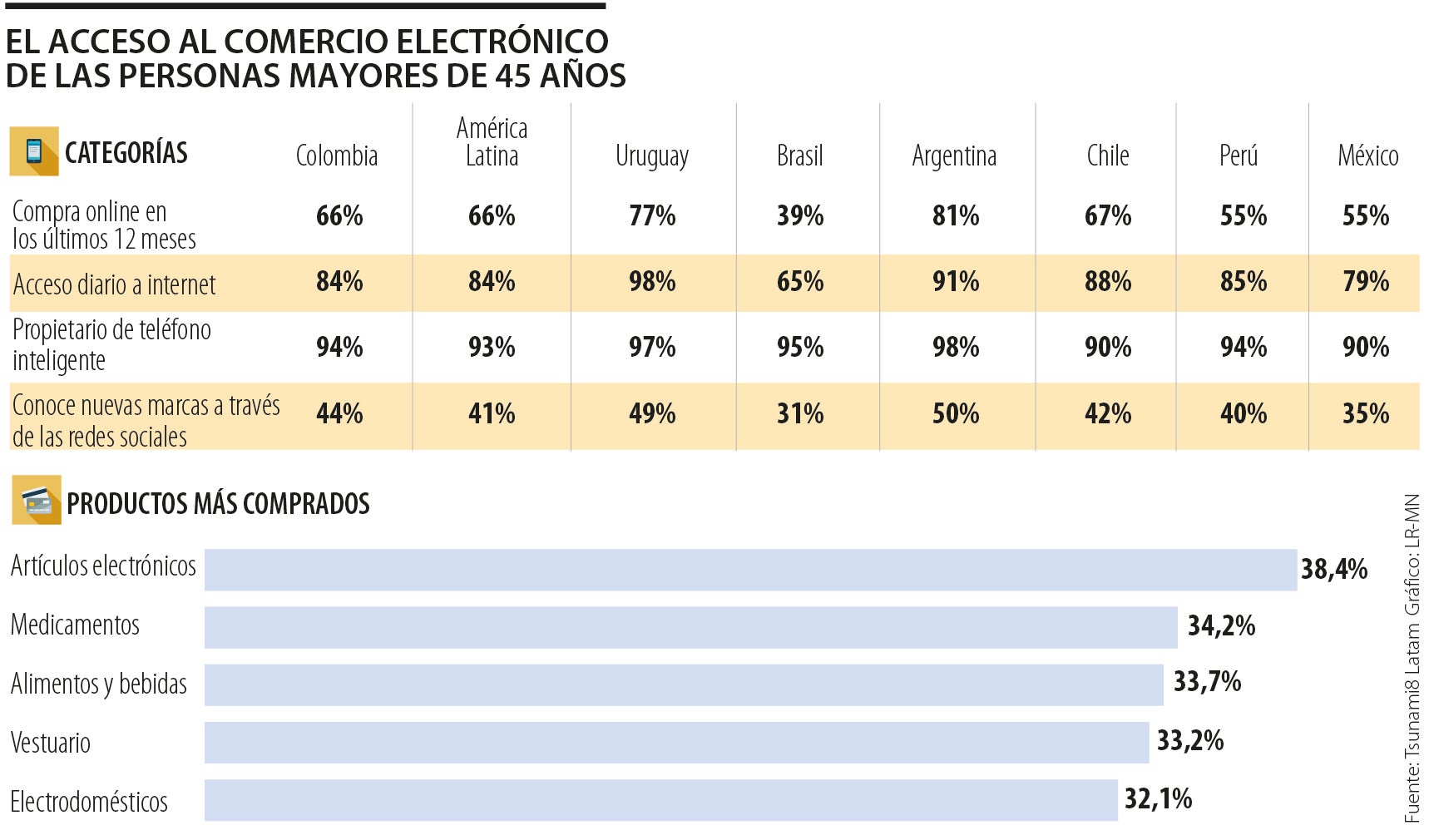 Según explica Natalia Puentes, fundadora de Pontes y una de las coordinadoras de la investigación de Tsunami8 Latam, responsable por el campo en México, Colombia, Perú y Chile, “con la pandemia, la gran mayoría quedó sin poder salir de casa e internet se convirtió en el único canal de comunicación con el mundo. La generación invisible en Colombia, que cuida a sus padres y a sus hijos, fortaleció el uso de las compras online para mantener su rol de proveedores”.