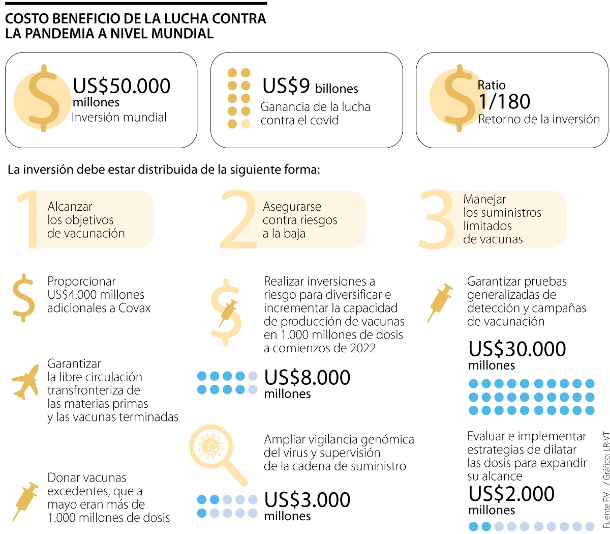 En esa línea, la receta del organismo internacional para superar la pandemia propone distribuir los US$50.000 millones requeridos en tres objetivos principales: alcanzar las metas de vacunación establecidas; asegurarse contra riesgos a la baja; y manejar el limitado suministro de vacunas.