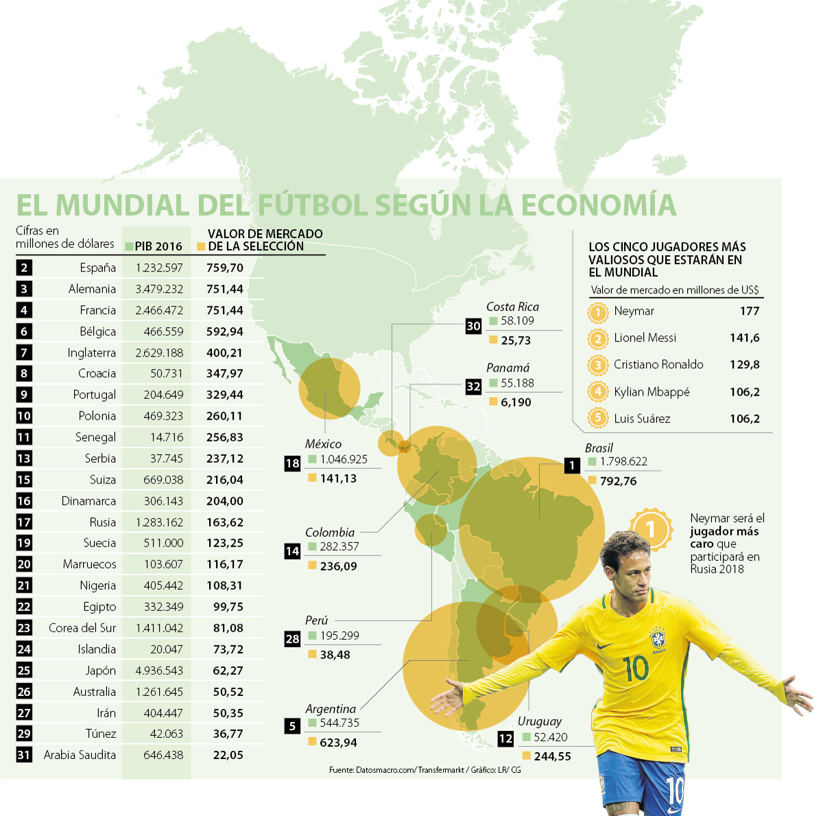 Si se tienen en cuenta los equipos que participarán en el Mundial por parte de la Conmebol, Brasil y Argentina serían las que más lejos llegarían en la competición tanto como por el valor de mercado de las selecciones, como por el tamaño de su economía. En el caso del primero, que además cuenta con Neymar (el jugador más valioso según Transfermarkt), tiene un PIB de US$1,7 billones y un equipo de US$792,7 millones. El segundo, que tiene a Messi, tiene un PIB de US$544.735 millones y un valor de US$623,94 millones.