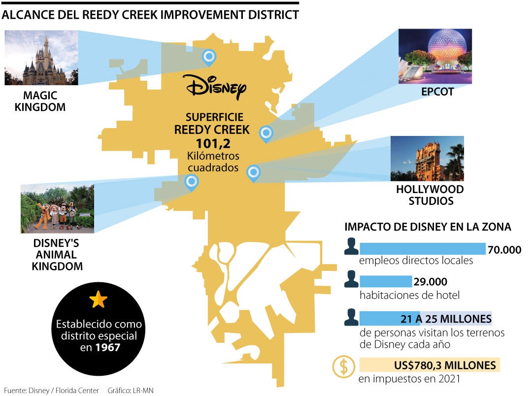 Con las líneas de electricidad y agua más cercanas a 11 millas o más de distancia, Disney consiguió que la legislatura de Florida creara el Distrito de Mejoramiento de Reedy Creek. El distrito fiscal especial estaba destinado a ayudar a pagar el costo de los servicios como energía, agua, caminos y protección contra incendios que la empresa necesitaría para construir estructuras icónicas como Cinderella Castle y Contemporary Resort.