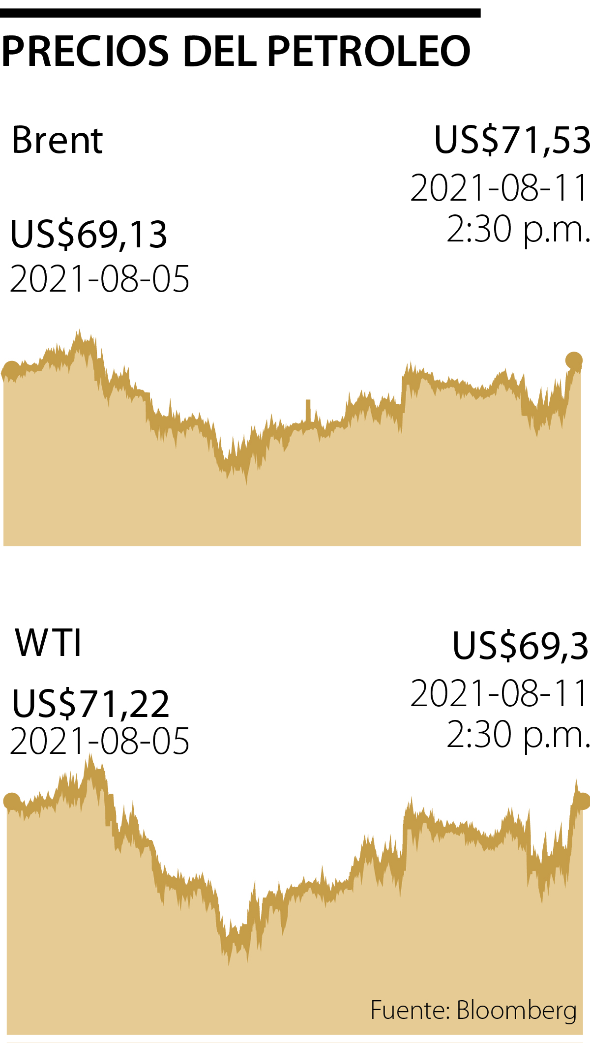El barril de petróleo West Texas Intermediate (WTI) subió 1,48% a US$69,30 mientras que el de referencia Brent aumentó 1,27% llegando a US$71,53, debido a la baja en los inventarios de petróleo y gasolina, que lograron una reducción en la última semana en EE.UU.