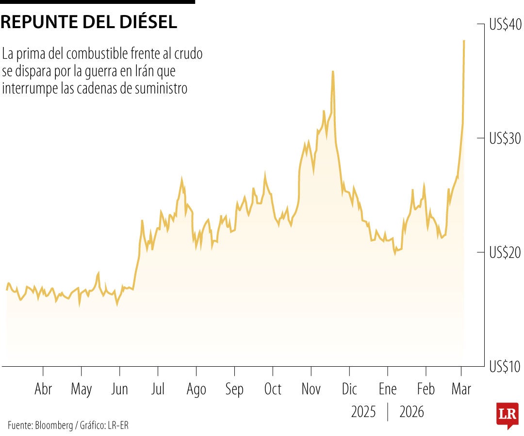 La prima del diésel frente al petróleo crudo aumentó a su nivel más alto desde el verano de 2023, ya que el conflicto en Oriente Medio amenaza los suministros mundiales.