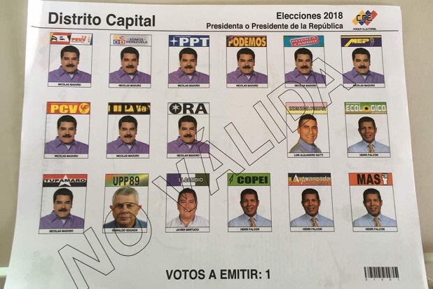 El próximo 20 de mayo los venezolanos participarán de elecciones presidenciales adelantadas por disposición de su presidente Nicolás Maduro. El Consejo Nacional Electoral (CNE) presentó el tarjetón con el que los habitantes del país vecino podrán elegir a su nuevo presidente, con la particularidad de que en este, Maduro aparece 10 veces, el mismo número de partidos que apoyan su candidatura a reelegirse.