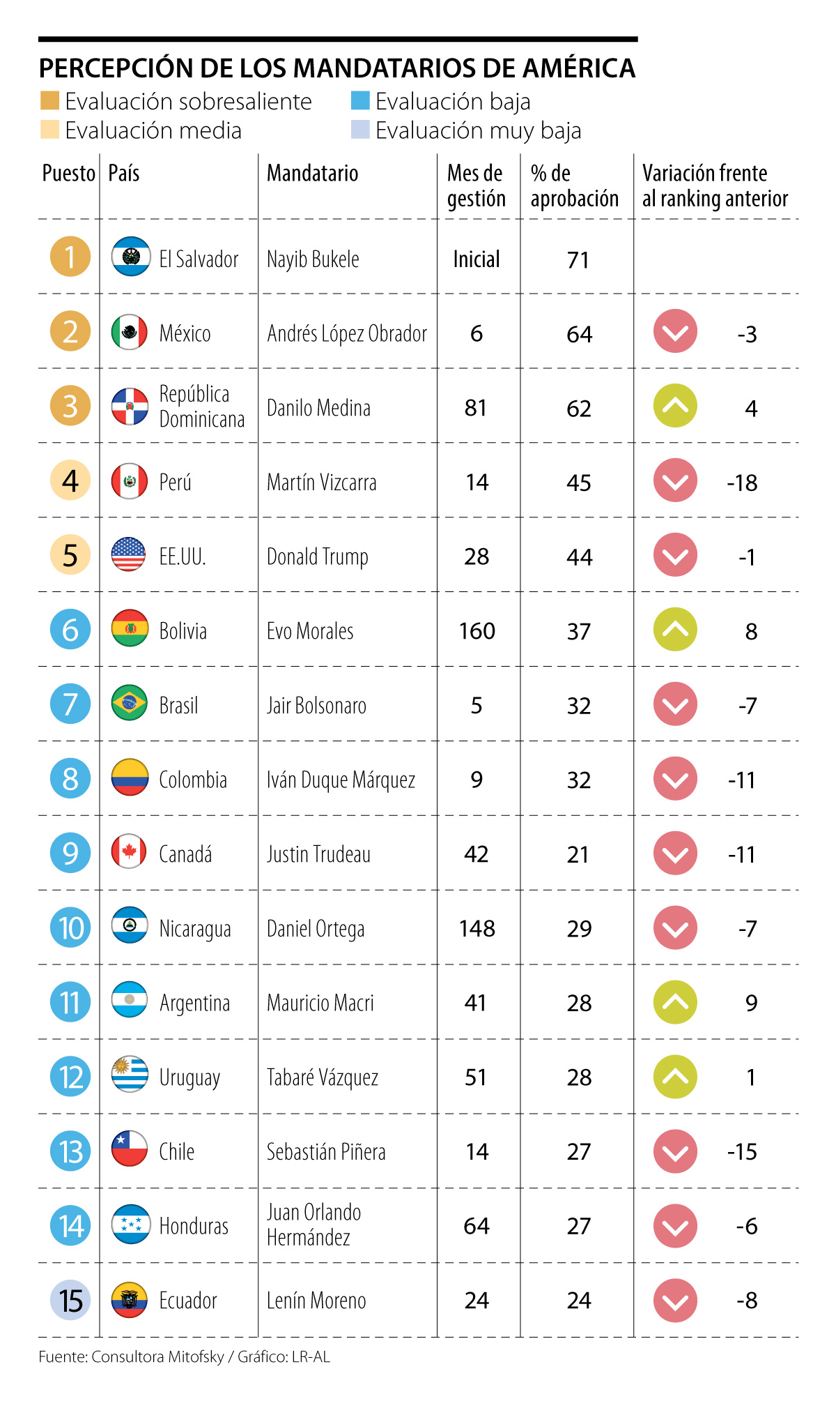 “La evaluación la hacemos bajo cuatro categorías: sobresaliente, que son aquellos jefes de estado que tienen una aprobación de más de 60%; una evaluación alta, que son los que tienen entre 59% y 50%; la media, con un porcentaje de aprobación de 49% a 40%; la baja, con 39% a 25%; y muy baja, que es menor a 24%. Llama la atención que solo tres de los 19 presidentes medidos en el ‘Ranking de Presidentes de América’ obtienen una evaluación sobresaliente por tener más de 60% de aprobación”, indicó Roy Campos, analista de la agencia que hizo el estudio, Consulta Mitofsky.
