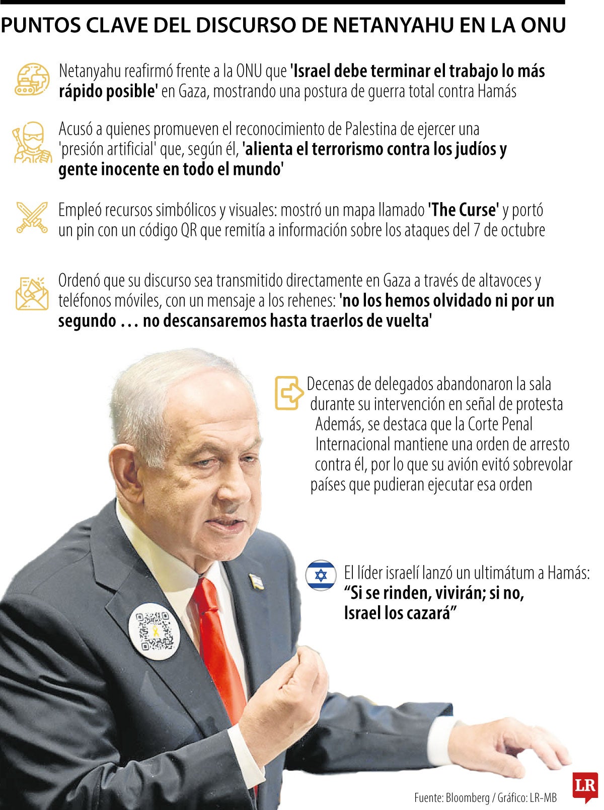 Netanyahu empleó recursos visuales para reforzar su mensaje: exhibió un mapa al que llamó “The Curse” y portó un pin con un código QR que dirigía a información sobre los ataques del 7 de octubre. En una maniobra poco usual, ordenó que su discurso fuese retransmitido en Gaza mediante altavoces y teléfonos móviles, buscando enviar un mensaje directo a los habitantes del enclave y a los combatientes de Hamás. “Nuestras valientes hermanas y hermanos, no los hemos olvidado ni por un segundo. No descansaremos hasta traerlos de vuelta”, dijo en alusión a los rehenes aún retenidos.
