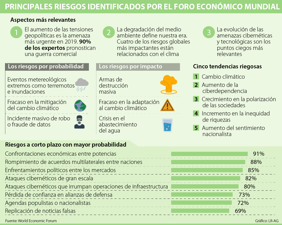 El informe también menciona otros riesgos para el curso de 2019. Algunos de ellos son la replicación de noticias falsas en los medios de comunicación, el fortalecimiento de las agendas populistas o nacionalistas y países que entran en default, como es el caso de Venezuela.