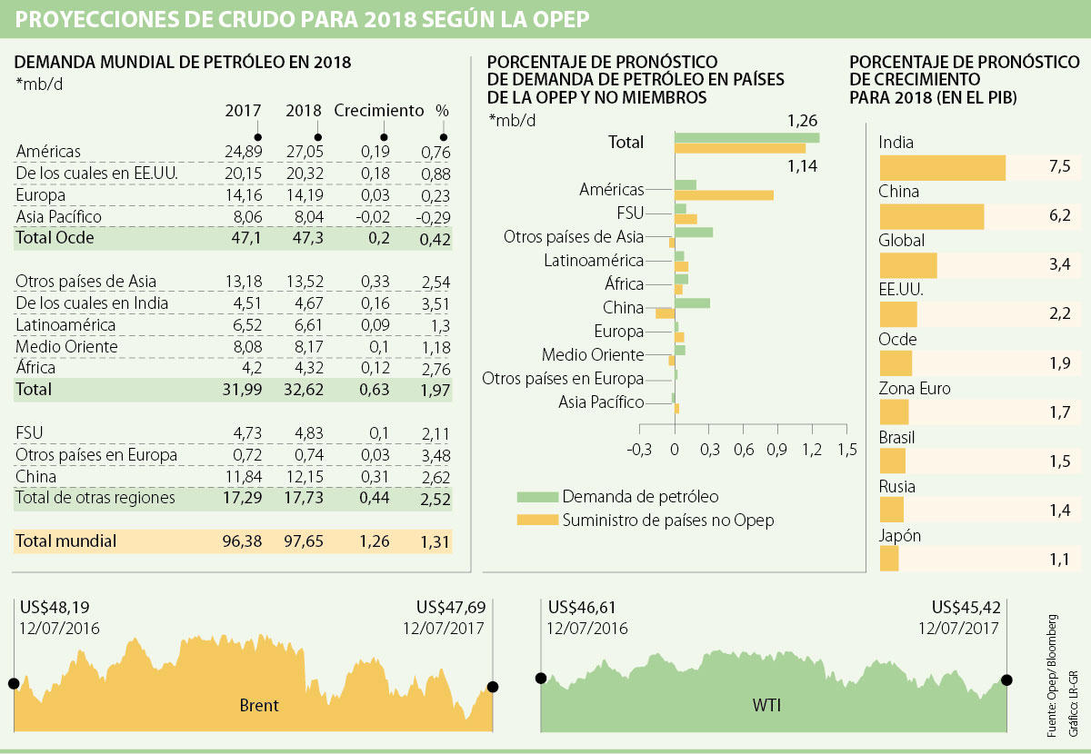 En el específico de América Latina la demanda aumentará 1,3% debido a que en 2017 necesitará 6,52 millones de barriles diarios mientras que en 2018 se espera que sea de 6,61 mbd.