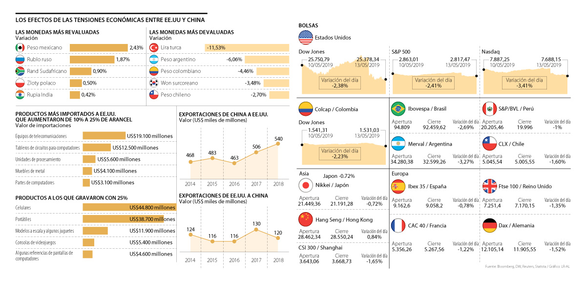 La guerra comercial entre China y Estados Unidos tiene en vilo a la economía mundial, pues ha generado un clima de incertidumbre que ayer se transmitió en la caída de todas las bolsas, con excepción de la de Hong Kong (índice Hang Seng).