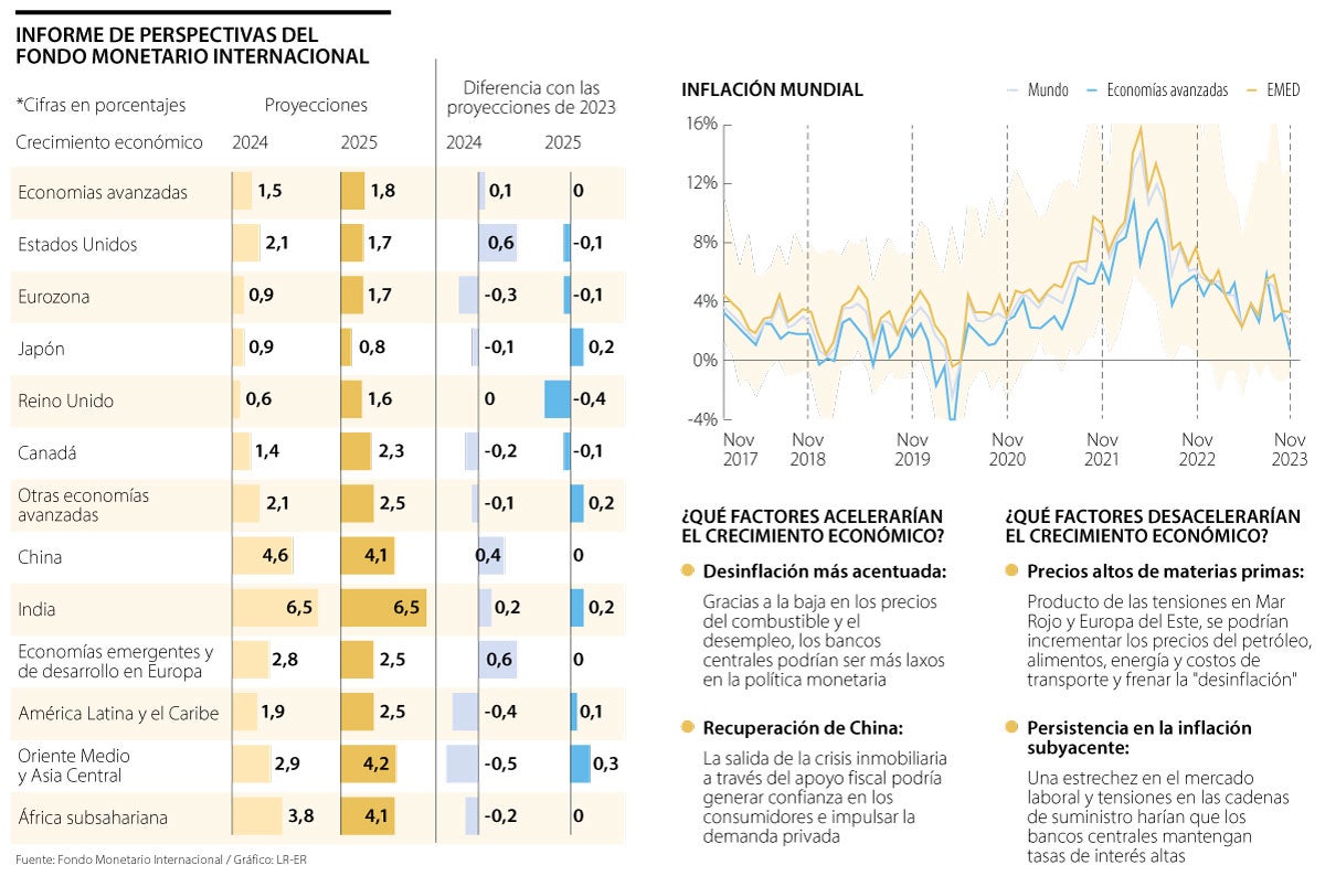 En cuanto a los riesgos para el crecimiento económico en el mundo, el FMI mencionó a la continuación de las tensiones geopolíticas, especialmente en el Mar Rojo y Europa del Este (guerra Ucrania-Rusia) que pondrían en riesgo el comercio mundial y el suministro de materias primas. De la misma forma, si la inflación subyacente no baja, factores como la estrechez del mercado laboral y tensiones en las cadenas de suministro harían que las tasas de interés no caigan.