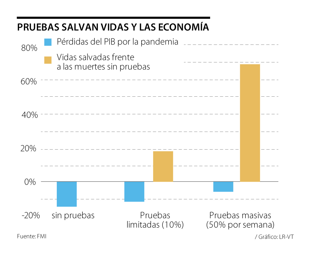 Los expertos comentaron que de una caída del PIB de 15%, la cifra podría pasar a 3,3% si más de 50% de los casos asintomáticos se identifican mediante pruebas rápidas y se aíslan para prevenir el contagio. Para eso, sería necesario que 60% de la población lograra hacerse una prueba a la semana.