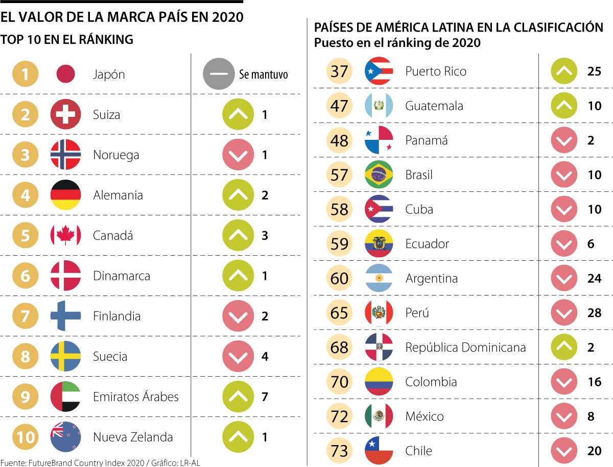 Puerto Rico se ubicó en el puesto 37 en el ranking global de 75 países y ascendió 25 lugares frente al listado del año inmediatamente anterior, mientras que Guatemala ocupó la posición número 47 en la clasificación mundial del valor de la marca país y subió 10 posiciones respecto al ranking de 2019.