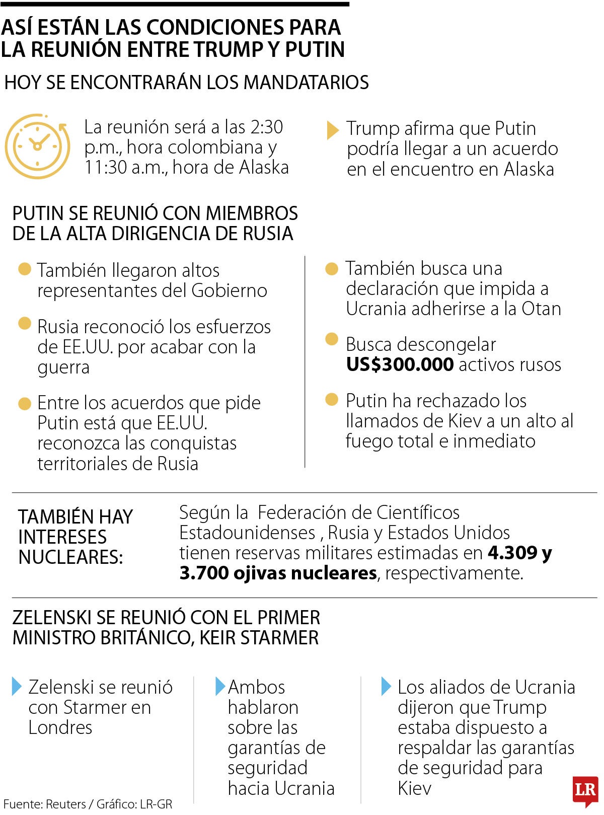 Hoy se llevará a cabo una reunión que podría dar fin al conflicto en Ucrania. Donald Trump y Vladimir Putin se verán las caras en Alaska para hablar de posibles acuerdos y llegar a un cese al fuego. Ante este hecho, el mandatario ruso citó ayer a una reunión con varios miembros de alta gerencia para discutir el rumbo de la cumbre. Entre los acuerdos que pide el presidente ruso se encuentra que EE.UU. acepte el reconocimiento de facto de las conquistas territoriales de Rusia; quiere una declaración que impida que Ucrania se una a la Otan y que podría exigir límites a su capacidad militar y al suministro de armas. Además, se busca el levantamiento de las sanciones y la situación de US$300.000 millones en activos congelados.