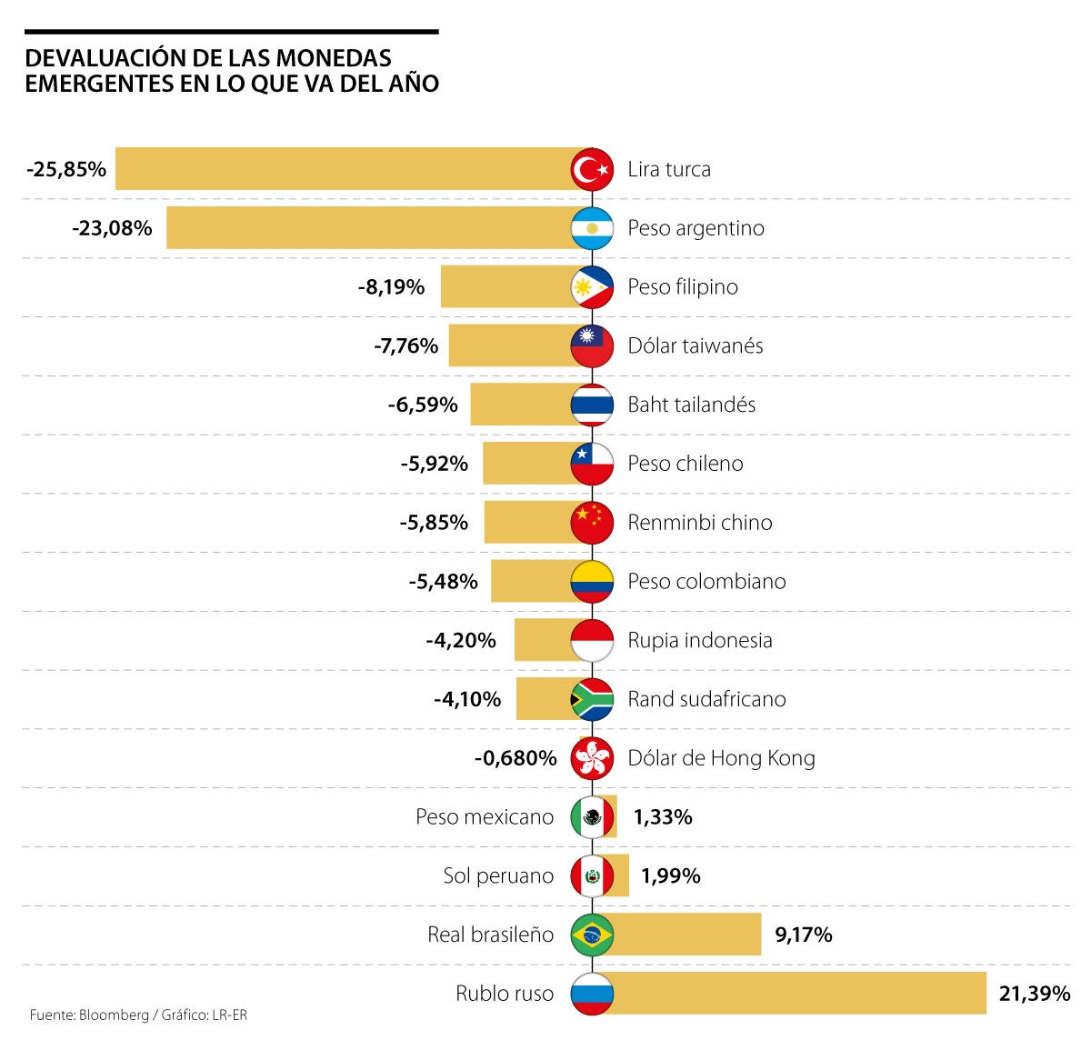 No todos los países de América Latina viven la misma situación. Las monedas que lideran el crecimiento de la región son el real brasileño (9,17%) y el sol peruano (1,99%). Según expertos, su crecimiento se debe al manejo de la política monetaria controlado por la impresión de dinero. En cuanto al panorama internacional, el rublo ruso ha registrado un significativo aumento (29,39%), sumado al peso mexicano (1,33%). Las divisas emergentes más devaluadas del mundo son la lira turca (-25,85%) y el peso argentino (-23,08), según Bloomberg.