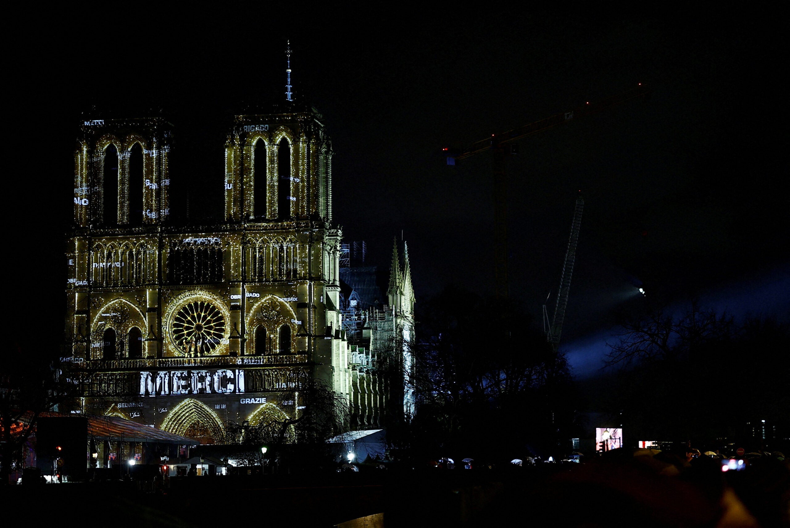 Vista general de la Catedral de Notre-Dame de París, cinco años y medio después de que un incendio arrasara la obra maestra gótica, durante un espectáculo de luces para su ceremonia de servicio de reapertura