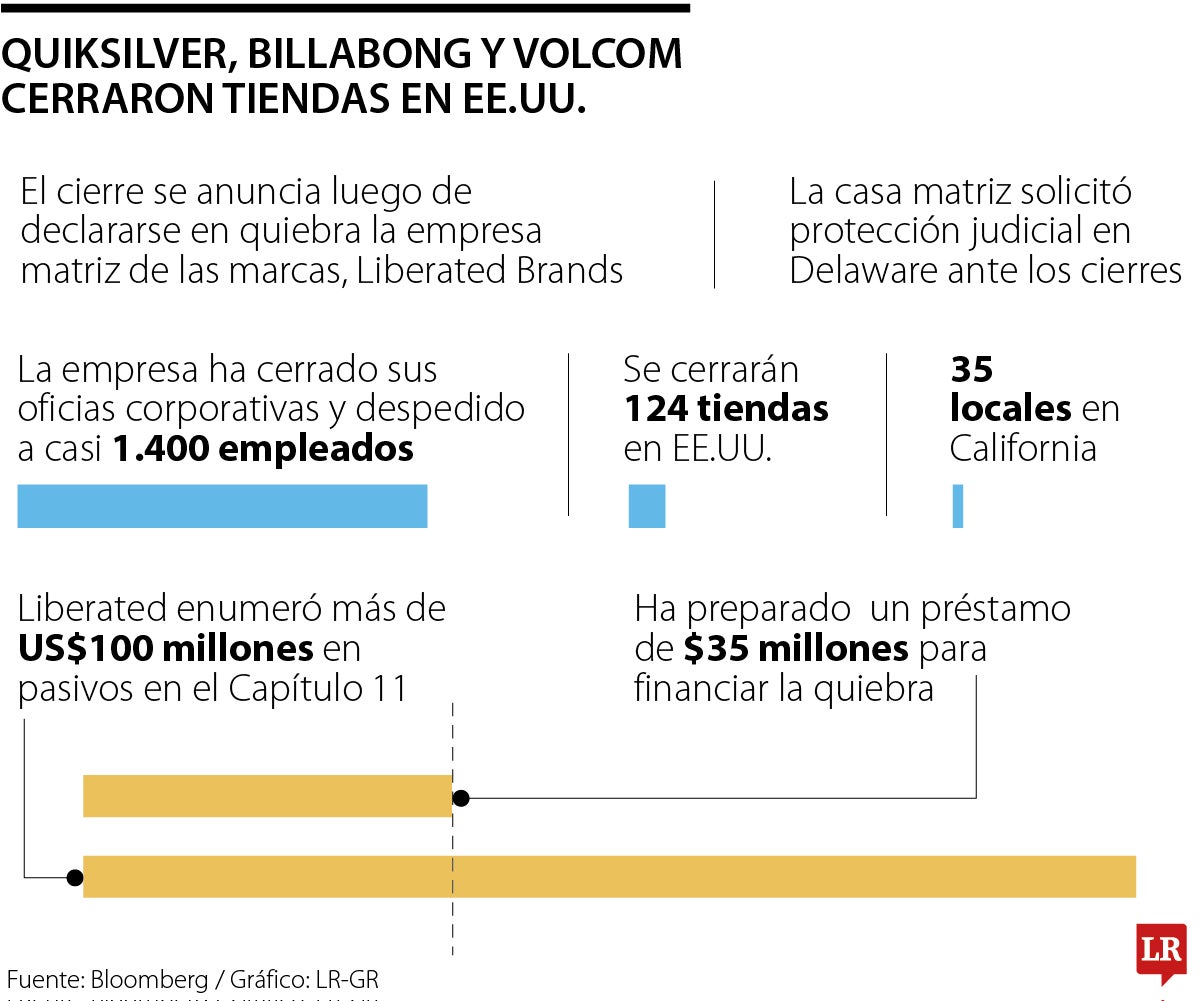 Un total de 124 tiendas en Estados Unidos de las marcas Quiksilver, Billabong y Volcom cerrarán luego de que la empresa matriz, Liberated Brands, se declarase en bancarrota por problemas financieros. La compañía busca reducir sus operaciones en Norteamérica, decisión que se suma al cierre de sus oficinas corporativas y el despido de casi 1.400 empleados.